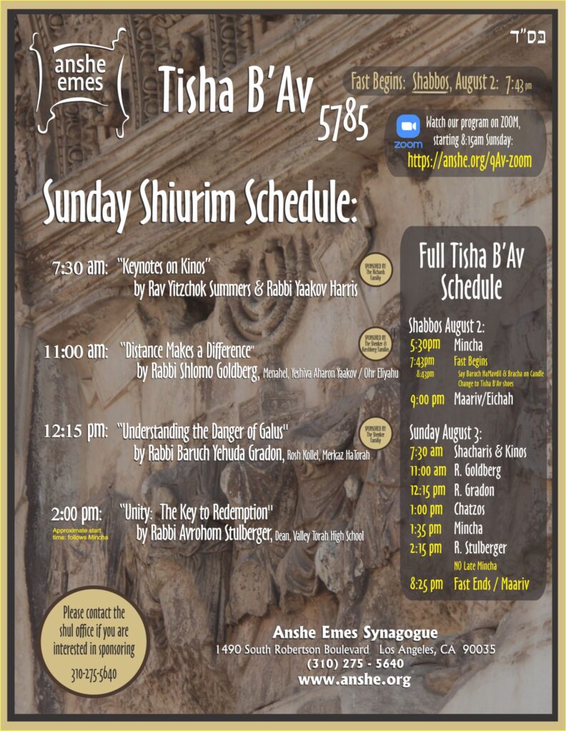 We have a full schedule planned for Tisha B’Av, including Rabbi Goldberg, Rabbi Stulberger, and Rabbi Gradon.